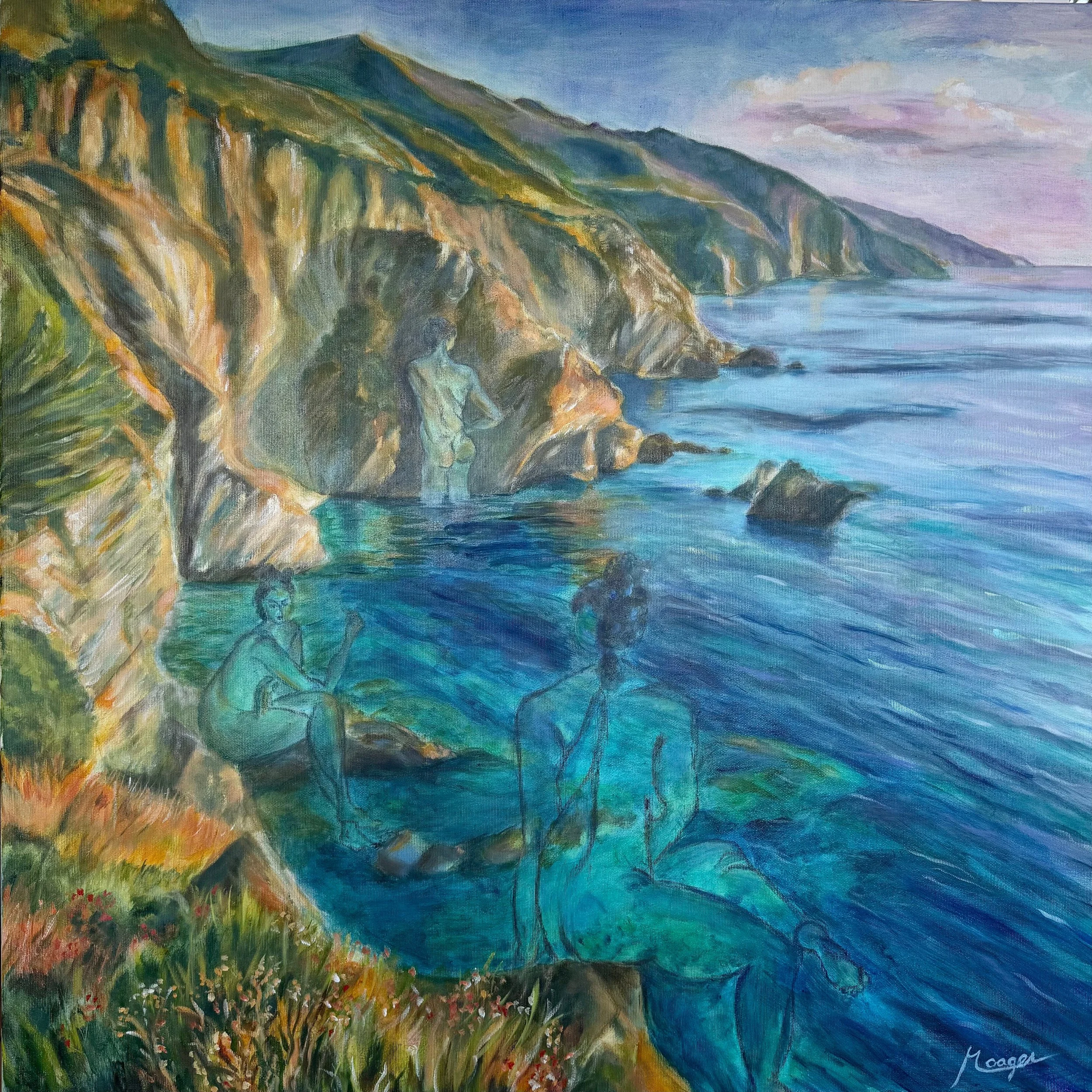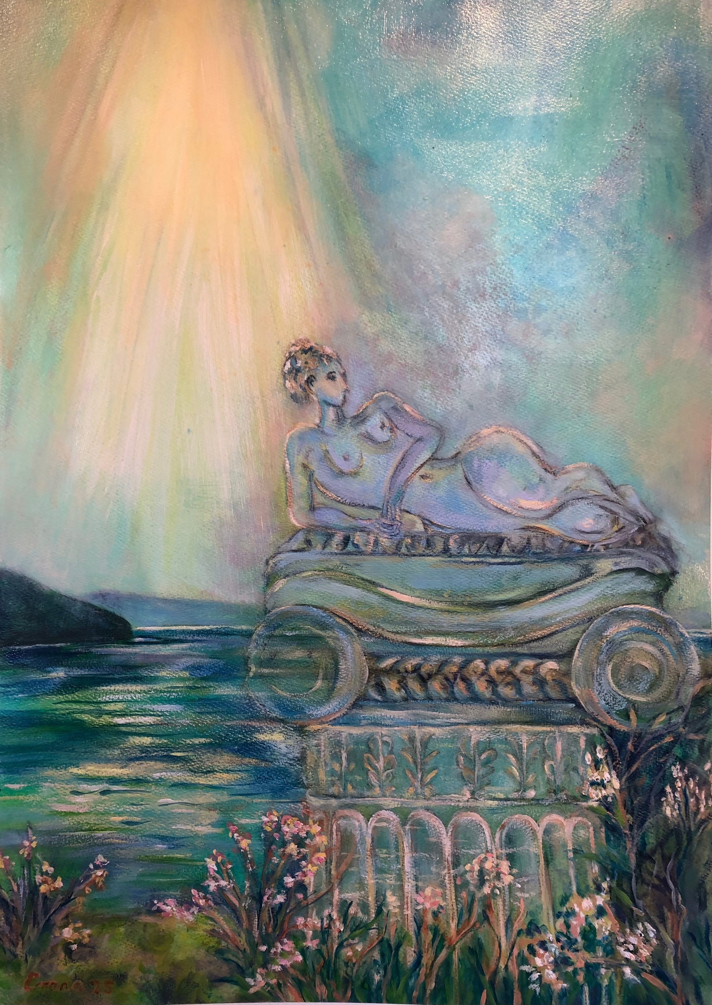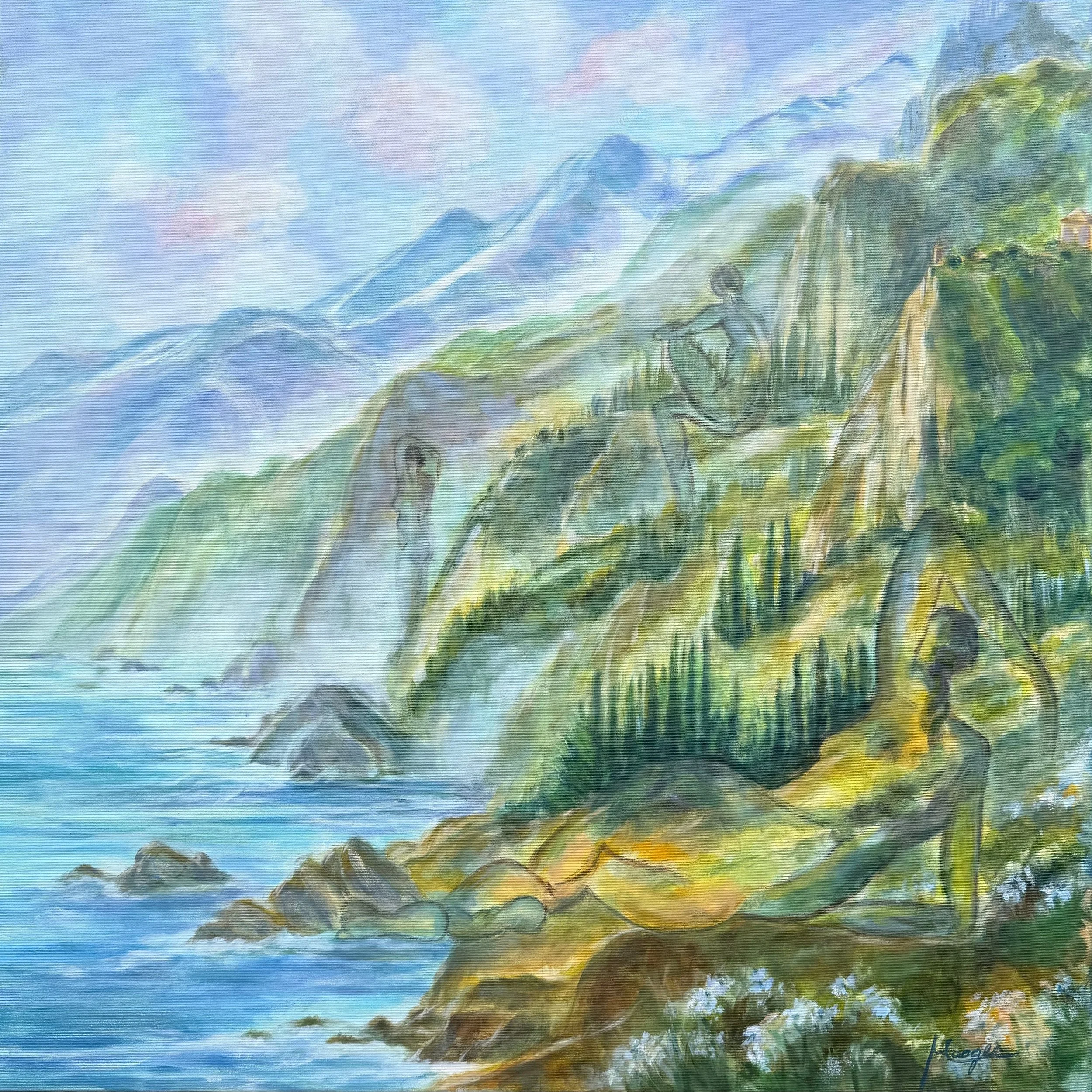 This time the sea speaks. Between the cliffs and the depths translucent figures rise - guardians of memory and salt. Each brushstroke feels like uncovering what the waves have hidden for centuries.