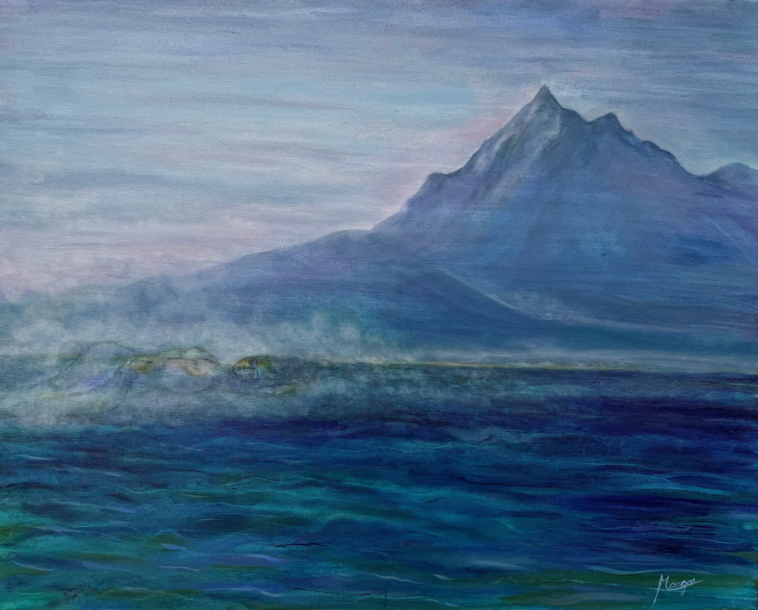 A veiled figure floats along the horizon beneath the sacred peak of Mount Athos, suspended in mist and mystery.This work explores themes of spiritual longing, inaccessibility and the thresholds between dream, memory and the divine.