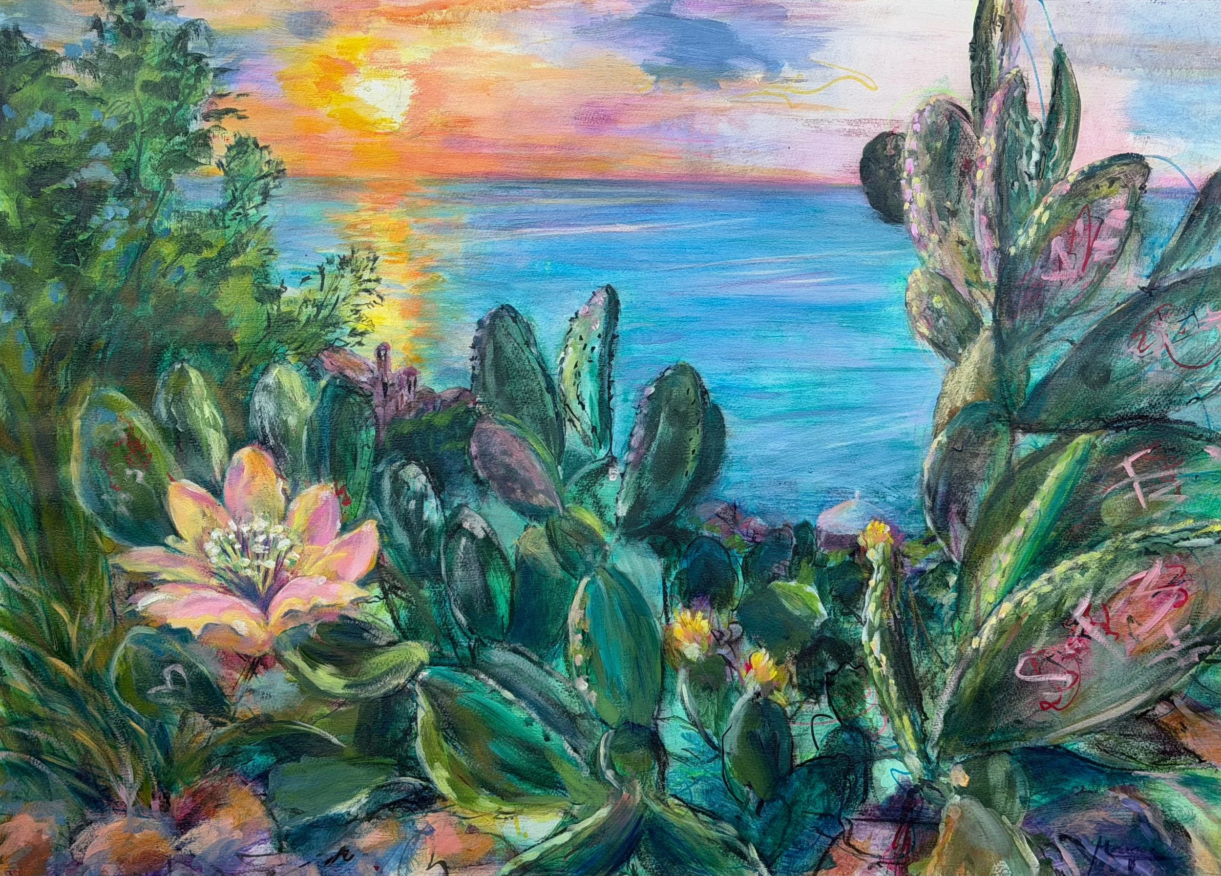 A desert garden meets the sea, where cactus shadows bloom in sunset light