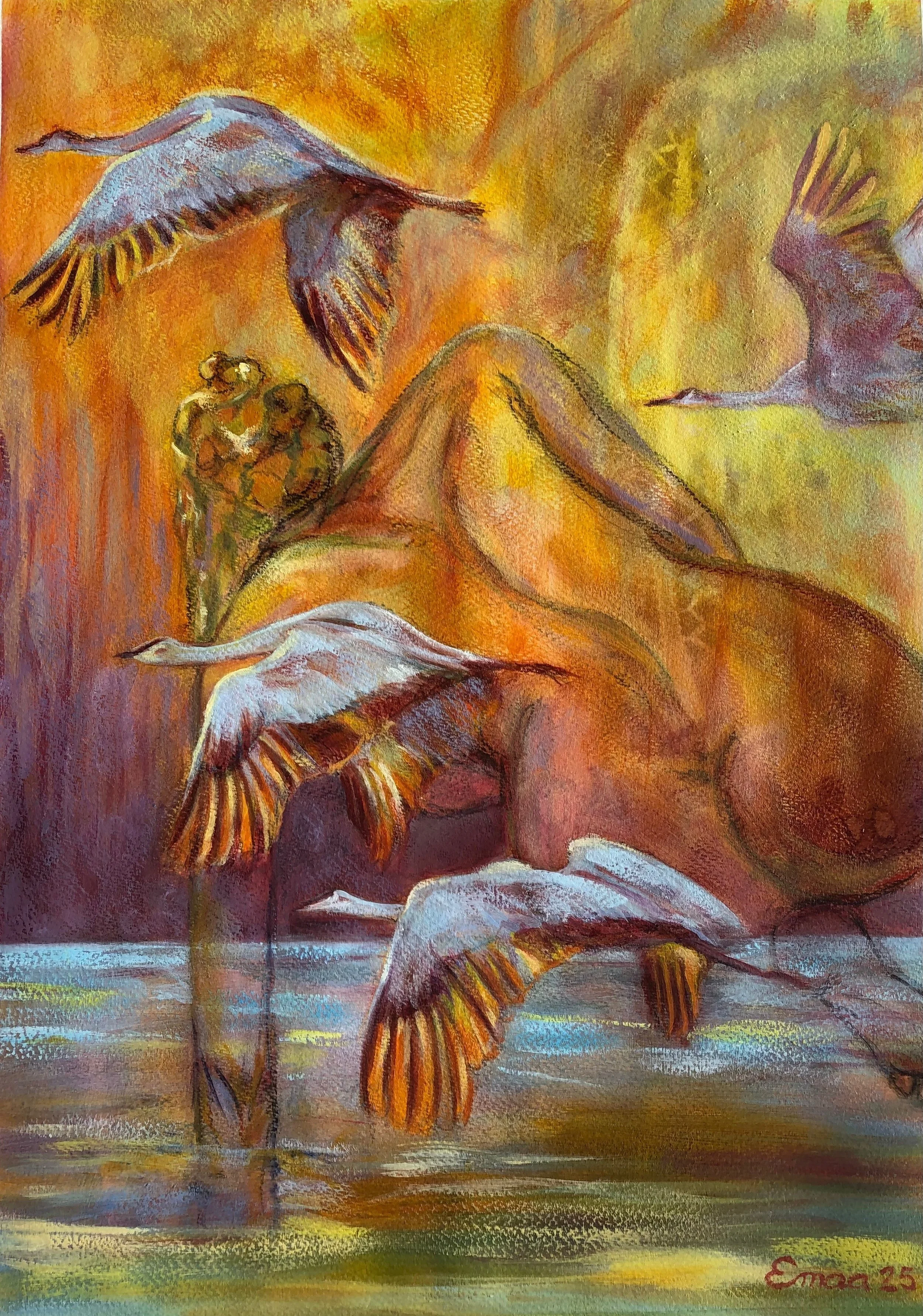 At sunrise form becomes flight, figures and birds rise together in light- a moment where spirit and sky merge in awakening